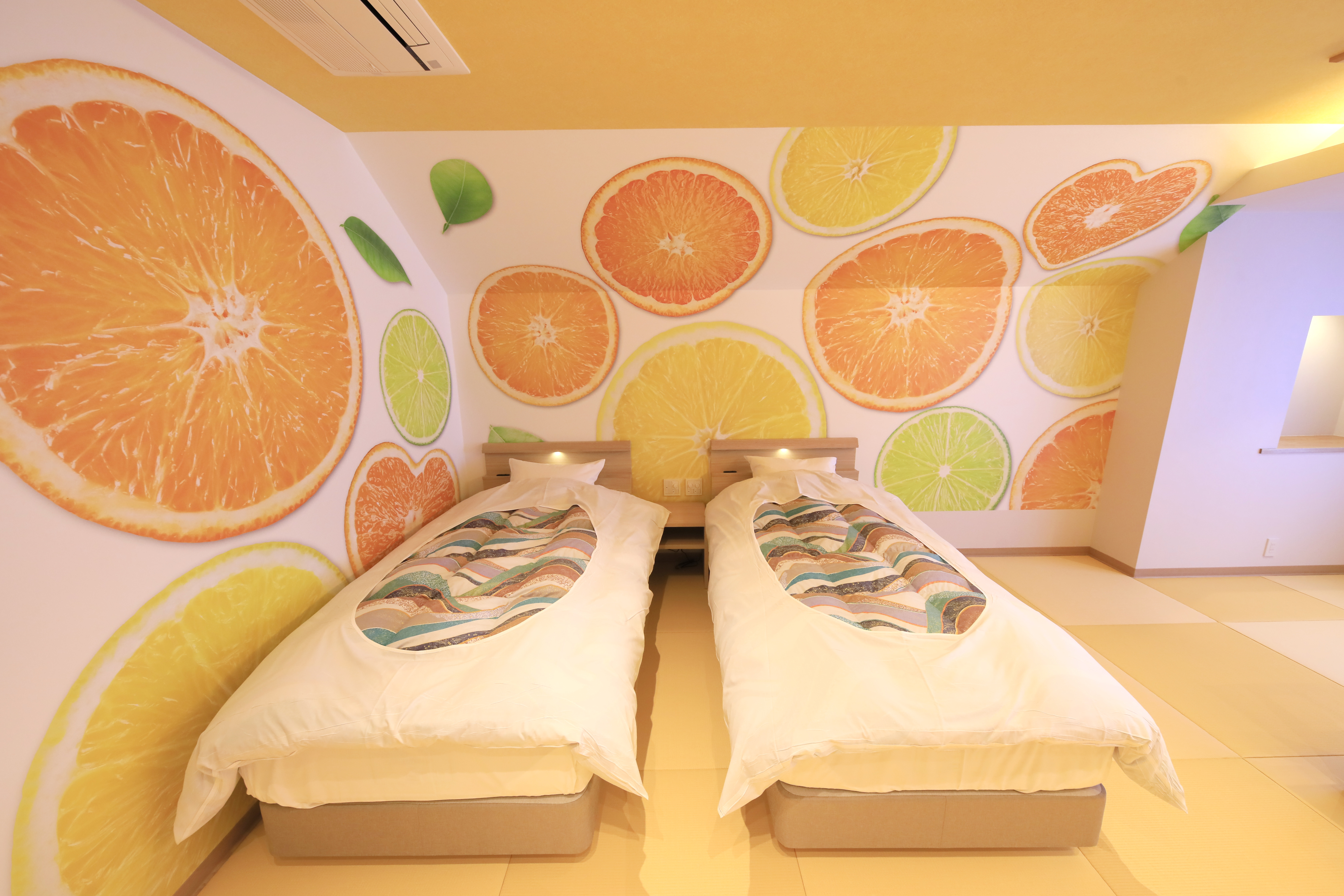 広さは約16畳で、柑橘をコンセプトに作られたお部屋で、派手かと思いきや非常に人気のあるお部屋なのだそう。