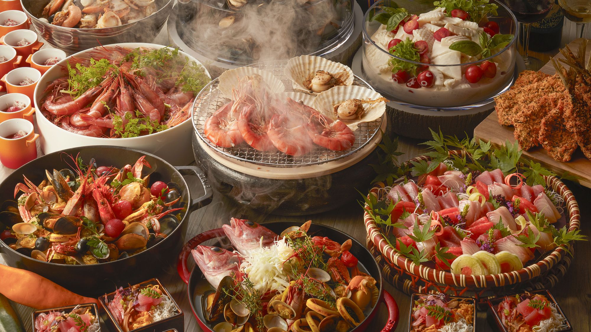 夕食は寿司のライブキッチンから、金目鯛のアクアパッツァなど和洋 約60種類のお料理をバイキングでいただけます。