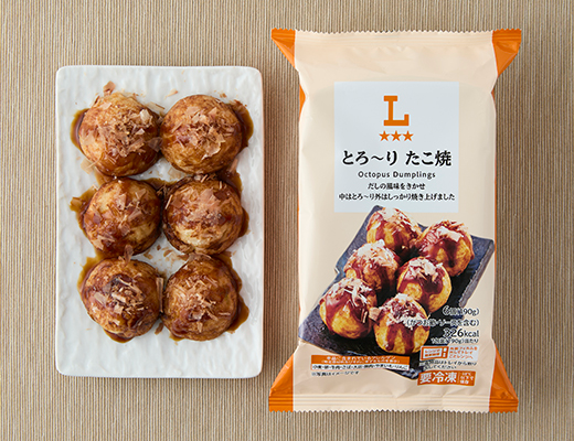 従来の商品から卵や山芋の配合量を増やして、ふわとろ感をアップさせた今月にリニューアルされたばかりの冷凍たこ焼きです。