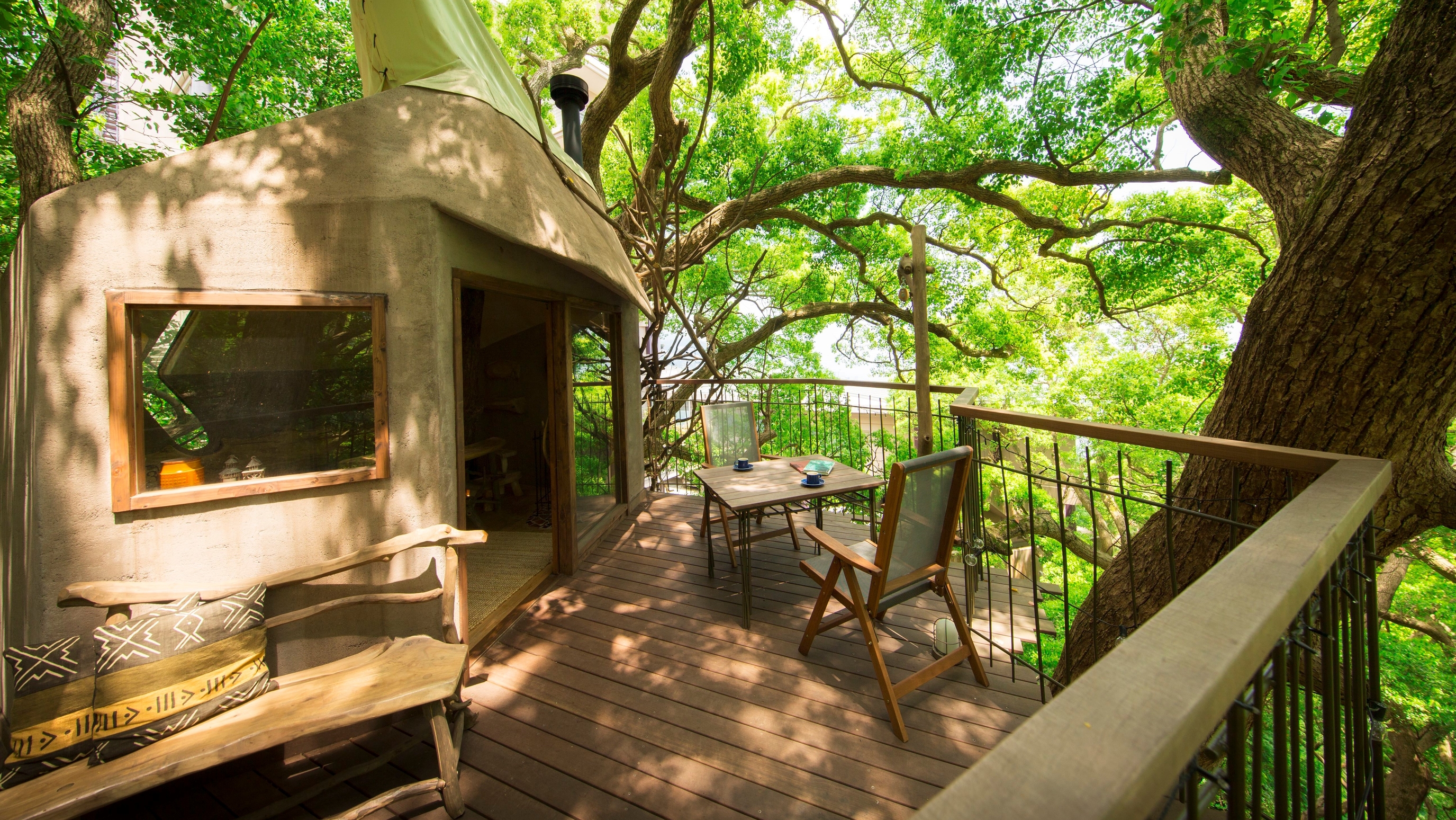 樹齢300年のクスノキに建てられた国内最大級のツリーハウス・森の空中基地 くすくすで、今の時期限定で新茶を使ったスイーツが味わえるイベントが開催されています。