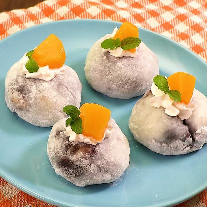 水気を切ったフルーツをこしあんで包み、もち生地で包んで成形したらホイップクリームやフルーツでトッピングして完成です。
