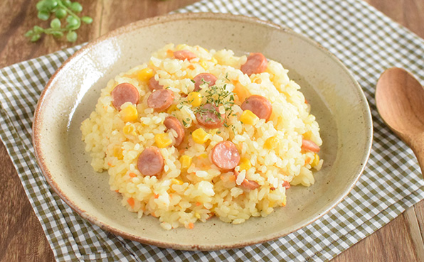 この粉末とお米を炊飯器に入れてウインナーやコーンと一緒に炊き上げれば炊き込みコーンピラフが簡単に作れます。