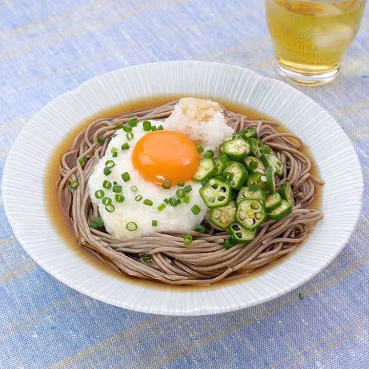 とろろやオクラなどのネバネバ食材や大根おろし、卵黄をのせた夏らしい組み合わせの冷やし蕎麦です!色々な食材が入っていて食感も楽しく、さっぱりと食べられるお蕎麦です。冷やし蕎麦の新しいレパートリーに、ぜひお試しください♪