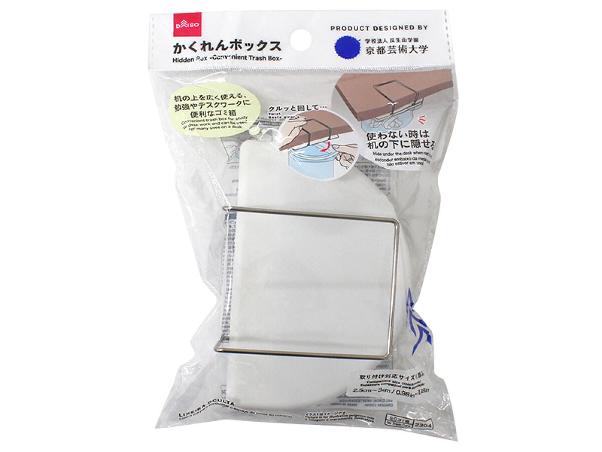 かくれんボックス(110円)は袋をセットして机に引っ掛ければ小型のゴミ箱になっちゃいます。