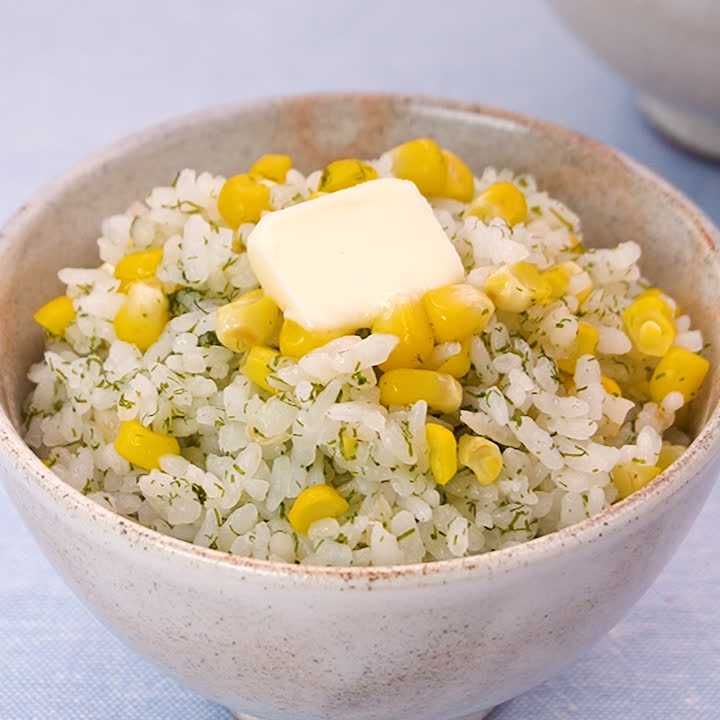 とうもろこしののり塩バターごはんは、お米の上にとうもろこしの実などを入れて炊飯し、仕上げにバターと青のりを乗せて混ぜ合わせた簡単レシピです。