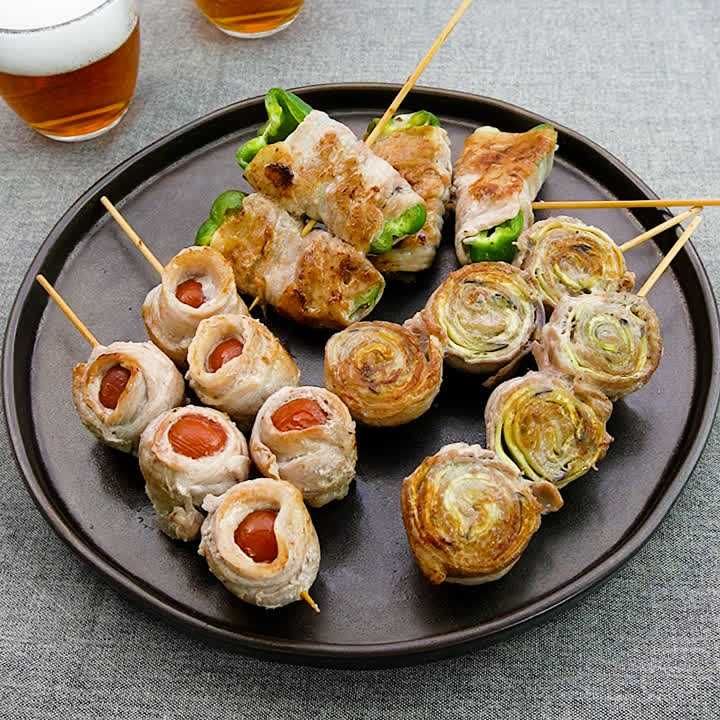塩コショウをふった豚バラの薄切り肉で夏野菜をクルクルと巻いて、それぞれ竹串にさし焼き目をつけながら蒸し焼きにするだけ!