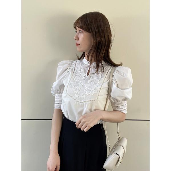 SNIDELのチャイナライクブラウス(1万6500円)は襟元がチャイナドレス風になっているボリューム袖ブラウスです。